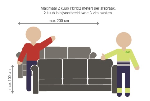 - Aangeboden stukken (met uitzondering van meubilair en ander huisraad) mogen niet groter zijn dan 160 x 90 x 90 cm en niet zwaarder zijn dan 30 kg.