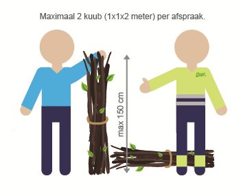 - Ook snoeiafval biedt u aan in bundels van maximaal 1,5 meter lang. U mag maximaal 2 m³ (kuub) per keer aanbieden