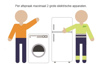 - Als u grote elektrische apparaten laat ophalen zoals koelkasten, wasmachines en tv’s mag u maximaal 2 grote apparaten per keer aanbieden.